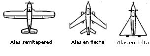 Forma. Las alas pueden tener las formas más variadas: estrechándose hacia los extremos (tapered) o recta (straight), en la parte del borde de ataque (leading) o del borde de salida (trailing), o cualquier combinación de estas; en forma de delta, en flecha, etc. Si la velocidad es el factor principal, un ala "tapered" es más eficiente que una rectangular (straight) porque produce menos resistencia; pero un ala "tapered" tiene peores características en la pérdida salvo que tenga torsión (ángulo de incidencia decreciente hacia el borde del ala).