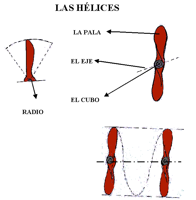 Las hélices. La hélice produce la tracción o fuerza hacia delante del avión, recibe su poder directamente del motor y es diseñada para desplazar una gran masa de aire hacia atrás. Desarrolla el impulso hacia delante y para los modelos o aeromodelos da el impulso de tracción y, con ello la posibilidad de que las fuerzas aerodinámicas actúen sobre el propio modelo haciéndolo volar.