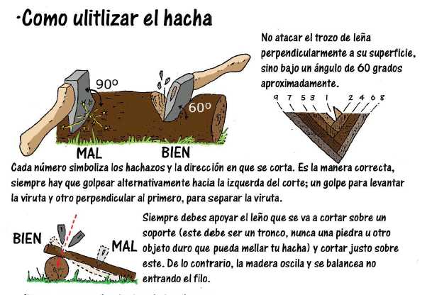 - Madera (leña) : Antes de encender el fuego, habrá que recoger un poco de leña para tener una reserva que sea suficiente para por lo menos media hora de encendido éste. La madera para quemar deberá ser de tres dimensiones : ramitas parecidas a cerillas de madera, que formará la madera para encender (yesca); madera de un grueso medio, para empezar el fuego y para secar, si fuere necesario, los troncos que darán las brazas; leños gruesos para mantener encendido el fuego. Se buscará leña seca, muerta, de ser posible con la corteza lisa, ya que así se desliza el agua sin que pueda penetrar dentro del tronco.