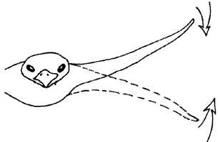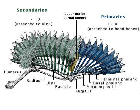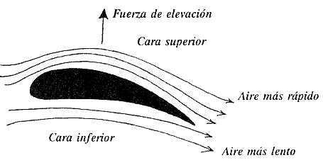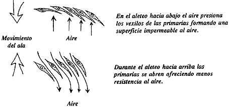 Si este modelo lo aplicamos a una estructura rígida, como el ala de un avión, al aumentar la velocidad se generan turbulencias en la parte final de la cara superior que provocan que el aire reduzca el efecto ascendente. Para evitar este problema, las aves poseen una estructura denominada álula, que consta de una o varias plumas cortas y rígidas localizadas en el dedo pulgar, con la función de cortar el aire desde la cara anterior del ala evitando las turbulencias que pudiesen ser fatales durante el vuelo. Recordemos que las extremidades superiores de las aves están perfectamente adaptadas para el vuelo, por lo que las plumas han adquirido una función particular. Las plumas primarias están insertadas en el hueso de la mano, son asimétricas y van a proporcionar la fuerza de empuje o propulsión, para despegar y maniobrar. Las plumas secundarias son las responsables de retener el aire que sirve para elevarse y mantenerse en vuelo. Para lograr el despegue, el ave impulsa el ala hacia abajo a través de los músculos pectorales (pechuga), que son los más grandes y fuertes del ave. Al iniciar este movimiento, las plumas primarias, que se encuentran dispuestas a manera de persiana, se elevan cerrando los espacios al chocar el vexilo de una sobre el raquis de la inmediata superior, haciendo una superficie impermeable al aire y atrapándolo para elevarse junto con la acción de las secundarias. Al subir el ala, las plumas se doblan hacia abajo abriendo los espacios entre ellas y creando una resistencia diez veces menor al aire que en el movimiento anterior. A través de varios ciclos continuos el ave puede avanzar altitudinalmente como un nadador lo haría horizontalmente. Para adquirir la fuerza necesaria para elevarse desde el suelo, las aves suelen aletear fuertemente en arcos grandes, generalmente de manera ruidosa y con un ángulo de ataque muy grande. Mientras más grande es el ave es mayor el esfuerzo que necesita para despegar, especialmente para adquirir la velocidad necesaria. Los albatros y otras aves marinas corren contra el viento grandes distancias para poder elevarse. Para evitar tal problema, estas aves y otras de tamaño similar habitan cerca de riscos, de donde se dejan caer y el aire atrapado bajo sus alas tiene la fuerza necesaria para elevarlos. El ángulo de ataque es muy importante también para aterrizar. Un modo de frenar en el aire es incrementar el ángulo y proyectar la cola abierta hacia abajo y adelante, funcionando como un paracaídas de frenado. Algunas aves tienen la necesidad de abrir las patas para presentar mayor superficie contra el aire. Aves con alas muy delgadas y largas tienen problemas para aterrizar, como los albatros, que generalmente acaban en el suelo dando maromas, debido a que tienen una reducida superficie alar de contacto para el frenado. FORMAS DE ALAS Y TIPOS DE VUELO