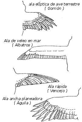 Dependiendo del medio que frecuenten y el tipo de vuelo que realicen, las aves presentan diferentes formas de alas que les permiten economía en el gasto del vuelo y funcionamiento eficiente bajo diferentes condiciones ambientales. La forma de las alas está dada en función del tamaño relativo de las plumas de vuelo y del número de éstas, lo que les confiere diferentes características aerodinámicas y de maniobrabilidad . La mayoría de las aves que viven en ambientes con vegetación cerrada, pastizales y el dosel del bosque presentan alas elípticas. En éstas las primarias más externas son más cortas que las centrales, así, cuando el ala se abre tiene una silueta redondeada. Este tipo de ala permite maniobrar en espacios cortos con gran rapidez, aunque no es muy eficiente para realizar vuelos largos, y la presentan muchos grupos de aves como las urracas, los cardenales, los trogones y los tucanes. Las aves que planean en los espacios abiertos, como las águilas y los zopilotes, tienen alas de silueta redondeada muy anchas en su base y con los extremos de las plumas separados, denominándosele ala ancha planeadora. Las golondrinas, vencejos, halcones y muchas aves migratorias, tienen alas largas, delgadas y rígidas, generalmente puntiagudas porque las primarias externas son las más largas. Es una clase de ala muy aerodinámica que les permite tomar gran velocidad en espacios amplios y maniobrar. De hecho, halcones y vencejos son los animales más rápidos de la Tierra, pues llegan a alcanzar velocidades de hasta 200 km por hora. Los colibríes presentan este tipo de ala con algunas modificaciones especiales a nivel de los sistemas muscular y óseo para realizar las maniobras más complejas posibles en espacios mínimos; a esta ala se le conoce como ala rápida. Las aves marinas planeadoras como los pelícanos, las gaviotas y las fragatas poseen alas muy largas y delgadas, en las cuales las plumas secundarias son muy numerosas y las primarias escasas y cortas. Este tipo se llama ala larga planeadora o de veleo, que es la característica de los albatros, que tienen las alas más largas de todas las aves, alcanzando una envergadura de hasta tres metros. Hemos mencionado los cuatro tipos básicos de ala que se reconocen, pero hay que tomar en cuenta que en gran cantidad de especies se encuentran formas intermedias. Lo que debe quedar claro es que la forma del ala está en estrecha relación con el tipo de vuelo que realizan. El vuelo más común entre las aves es el vuelo batido, que consiste en iniciar el vuelo haciendo movimientos enérgicos de las alas para el despegue y dar aleteos frecuentes de arriba hacia abajo para mantenerse en el aire, cambiar de altitud, de velocidad y maniobrar. Aunque este tipo de vuelo es común, es también el más costoso en energía porque requiere de gran esfuerzo de los músculos pectorales. Una variante es el revoloteo, que consiste en mantenerse en un lugar fijo mediante movimientos enérgicos de las alas. Este ha sido desarrollado con maestría por los colibríes gracias a su peculiar estructura muscular, pues tienen músculos igualmente fuertes para elevar que para bajar las alas y la cavidad de la articulación del brazo con el cuerpo es muy ancha. Las puntas de las alas describen la forma de un ocho acostado. Para mantener este vuelo se necesita una gran cantidad de aleteos por segundo; por otro lado, debido a que las alas son de tipo rápido como en los halcones, éste es uno de los vuelos más complicados pero con la mayor capacidad de maniobra conocida, pues los colibríes son las únicas aves capaces de volar hacia atrás. OTROS USOS DE LAS ALAS Las alas se utilizan secundariamente para otros tipos de desplazamiento o actividades. Se han aplanado y perdido las plumas de vuelo en los pingüinos transformándose en aletas para nadar de la misma manera que los delfines. Algunas especies de patos, las alcas y los petreles buceadores, las utilizan para "volar" dentro y fuera del agua, lo que también hacen los tordos de agua, las únicas paseriformes realmente acuáticas. Las garzas utilizan sus alas para hacer sombra sobre el agua y atraer a los peces que van a consumir; los búhos abren sus alas para simular que aumentan de tamaño y ahuyentan así a sus depredadores; los turquitos las usan para producir ruidos durante el cortejo.