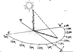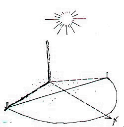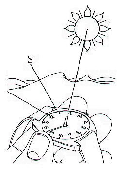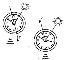 11. APRENDE TRES METODOS DE ORIENTARTE SIN BRÚJULA. DEMUESTRA POR LO MENOS DOS Podemos quedar aislados en la naturaleza y no disponer de mapa ni brújula, o encontrarnos en una zona donde el uso de la brújula sea mas perjudicial que otra cosa, por ejemplo en regiones polares o terrenos ricos en mineral de hierro. Caso de hallarse a más de 60º de latitud en el hemisferio norte y si no se conoce la propia posición o se tiene la certeza absoluta de que siguiendo el curso de un río cercano se ha de llegar a un poblado, los Departamentos de Defensa de los Estados Unidos y el Canadá recomiendan encarecidamente a las personas extraviadas que no se muevan de donde están y esperen allí hasta recibir auxilio. Son numerosos los organismos oficiales, de diversos países, que se mantienen al acecho de cualquier presencia extraña en el circulo polar, ya se trate de grupos de expedicionarios o víctimas de un accidente aéreo, y toda irregularidad o llamada de socorro da pie a la actuación inmediata de equipos de búsqueda y salvamento. No obstante, en distintas circunstancias o en otras partes del mundo podrá ser aconsejable salir cuanto antes en busca de la civilización, en vez de esperar a que ésta venga a nosotros. En tales casos es importante no "volverse a perder", lo que implica saber regresar al 'punto de partida si uno se aleja de él y no ponerse en marcha hasta conocer con exactitud adónde se va. A. COMO ORIENTARSE DE DÍA EL SOL Recuérdese que el sol sale por el este y se pone por el oeste, pero poquísimas veces lo hace por el este y el oeste exactos. El sol sale por el este tirando ligeramente hacia el sur y se pone por el oeste tirando ligeramente hacia el norte. La declinación, o sea el ángulo que forma con cada uno de ambos puntos cardinales, varía según las estaciones del año. Téngase en cuenta, además, que la dirección es un concepto relativo; depende de lo que uno pretenda. Para llegar simplemente a un punto o lugar determinado, habrá que alinear la direcci6n con el norte magnético o geográfico. Pero si sólo queremos conservar todo el tiempo la misma dirección, entonces el arco solar es nuestro mejor punto constante de referencia. verifíquese la dirección al menos una vez al día, empleando cualquiera de los métodos que siguen.