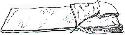 Las bolsas de dormir tienen dos formas básicas: la rectangular y la que se conoce como momia por su diseño característico que aparenta una momia. (Fig. 8 y 9) LA RECTANGULAR tiene la ventaja, por su diseño, de ser más amplia lo que da oportunidad para moverse adentro. Para climas calientes es ideal. Hay algunos modelos que tienen el cierre completo (todo un costado y da vuelta en la parte de abajo haciendo una L), lo cual permite abrirla completamente y usarla como cobija o unirla con otra igual para hacerla más grande. LA MOMIA es más confortable en climas fríos y tiene la ventaja de ser liviana. Hay muchas variaciones de este estilo por lo que ha llegado a ser la más popular para los que caminan con mochila. Tomando en cuenta su rellenó las bolsas de dormir se pueden dividir en tres clases: las de pluma, guata, y las de relleno sintético.