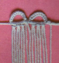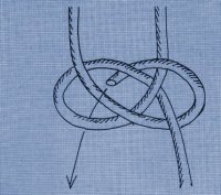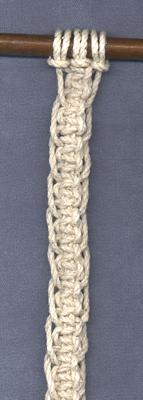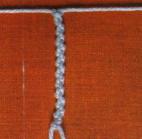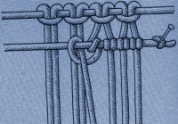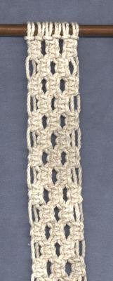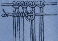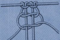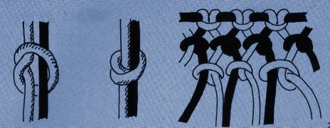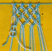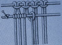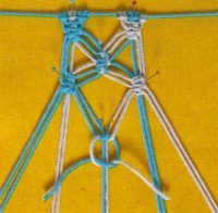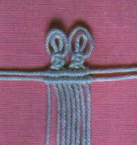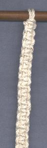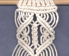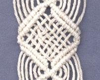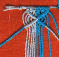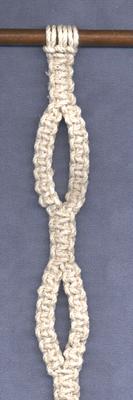 La palabra 'macramé' es de procedencia árabe. Su antigüedad se remonta a los asirios. "La tecnica del anudado conocida con el nombre de macramé tiene su origen en un trabajo manual árabe. Posiblemente el nombre de "Migramah", que en arabe significa flecos anudados, sea de donde ha salido la palabra afrancesada de macramé. Este nombre es muy acertado, ya que en el trabajo de macramé los hilos se anudan entre sí a modo de enrejados. Nudos nálogos a los del macramé, en cuero, lino o papiros han sido hallados en tumbas egipcias. Esta tradición continuó en Oriente hasta la Edad Media. De los arábes pasó a España y tuvo un gran arraigo en Castilla y León. Estuvo muy de moda en toda Europa durante los siglos XIV, XV, XVI. En la época de las grandes exploraciones marítimas se multiplicaron las obras hechas en macramé y se utilizaron, sobre todo, en el intercambio de mercancías en los puertos comerciales de América y China. Muchos nudos marineros se anudan igual que los que se utilizan en macramé. Al mismo tiempo, se convirtió en pasatiempo, incluso en la corte inglesa, para distraer a las grandes damas durante sus largas horas de soledad. Pero en el mismo momento que se extendió la moda a todo el mundo, el macramé sufrió un eclipse y después fue olvidado hasta que de nuevo ha vuelto a reaparecer, gracias a las originales decoraciones algo bohemias de nuestros hogares, y a la sugestiva posibilidad de crear trabajos originales y de inspiración personal"(Labores maravillosas 6 - La fantasia del macramé) Se precisa cordel, cordón o cuerda de diversos tipos y cualidades; sisal, pita, algodón, hilo, yute, cañamo, etc.(explica porque se recomiendan estos hilos) La lana, no es apropiada para este tipo de trabajo, ya que se rompe con gran facilidad al efectuar nudos. Para aprender a hacer nudos, se aconseja utilizar cordoncillo en dos colores, así los nudos, se aprecian más facilmente, y permite una más rapida comprensión del tejido que se va formando. Sisal, pita, algodón, hilo, yute, cañamo. En general estos hilos son buenos ya que son firmes y nose deforman al apretarlo. 1. SIMPLE:Es un nudo muy sencillo, es tambien llamado cote o media malla.