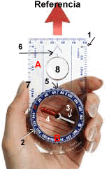 - Con la brújula y situado en el punto de partida (o punto 1), toma el rumbo con respecto al Norte, que siga el