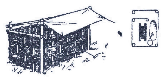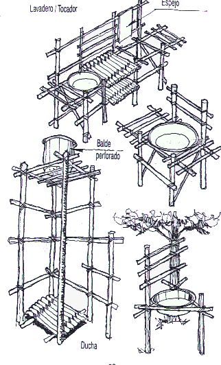 También para campamentos largos se puede hacer una ducha , como la del dibujo , que es un balde con agua perforado .