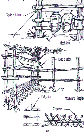 | Los mochileros son las construcciones más tipicas que se hacen en los campamentos . El más común es el mochilero tipo "A" que es uno de los más fáciles de hacer . Si tu campamento es hacia un lugar húmedo ( el mar ) o con rocío , se debe cubrir con un toldo plástico para evitar que se mojen las mochilas .