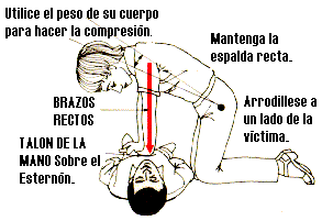 Con la persona acostada en una superficie dura, descubrir el tórax. Aflojar todo. De rodillas junto al paciente, ubicar el tercio medio del esternón (medio del pecho) allí presionar con el talón de la mano, la que tiene menos fuerza va primero. Los dedos no tocan el tórax. Luego presionar con movimientos de 50 a 60 veces por minuto en adultos y de 60 a 80 en niños. La compresión debe ser rítmica y enérgica, pero suave y sin interrupciones.